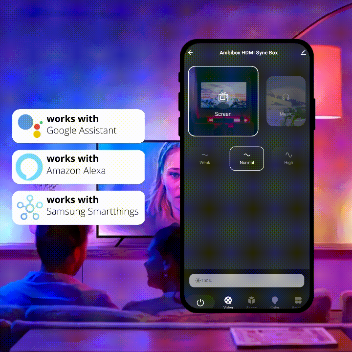 El sistema de sincronización de audio y video Ambibox funciona como puente entre un dispositivo de reproducción de multimedia y su Tv/Monitor. El Ambibox procesa en tiempo real la imagen y la transmite a los LEDs para simular los colores de reproducción.